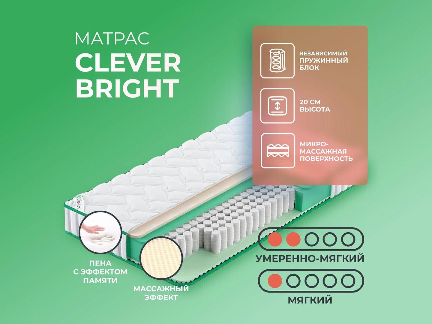 Фабрика Clever получила заслуженную репутацию, благодаря применению новых технологий и безупречному соблюдению стандартов качества. Clever Bright — образец продукта с лучшими характеристиками и доступной ценой, матрас создан из дышащих тканей, с эффектом вентиляции.
